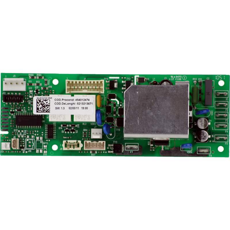 Elektroniczna płyta sterująca do ekspresów DeLonghi ECAM 23.450. Część odpowiadająca za kontrolę wszystkich kluczowych funkcji urządzenia. Na płycie znajduje się naklejka z numerem kodowym DeLonghi (rozpoczynającym się od 52), który musi odpowiadać jednemu z kodów: 5213213671, 5213213191, 5213212831, 5213212311. Jeśli Twój numer kodowy nie figuruje na liście, skontaktuj się z nami mailowo.