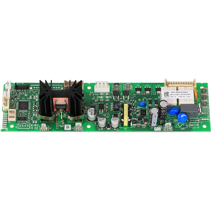 Płyta elektroniczna sterująca (Leistungsplatine SW 1.0) do automatycznych ekspresów DeLonghi serii ECAM 45. Kontroluje pracę grzałki, pompy, młynka, zaworów i innych komponentów systemu. Na płycie znajduje się biały nalepka z numerem kodowym DeLonghi rozpoczynającym się od 52. Numer musi być zgodny z numerem Twojego urządzenia. W przypadku wątpliwości prosimy o kontakt mailowy.