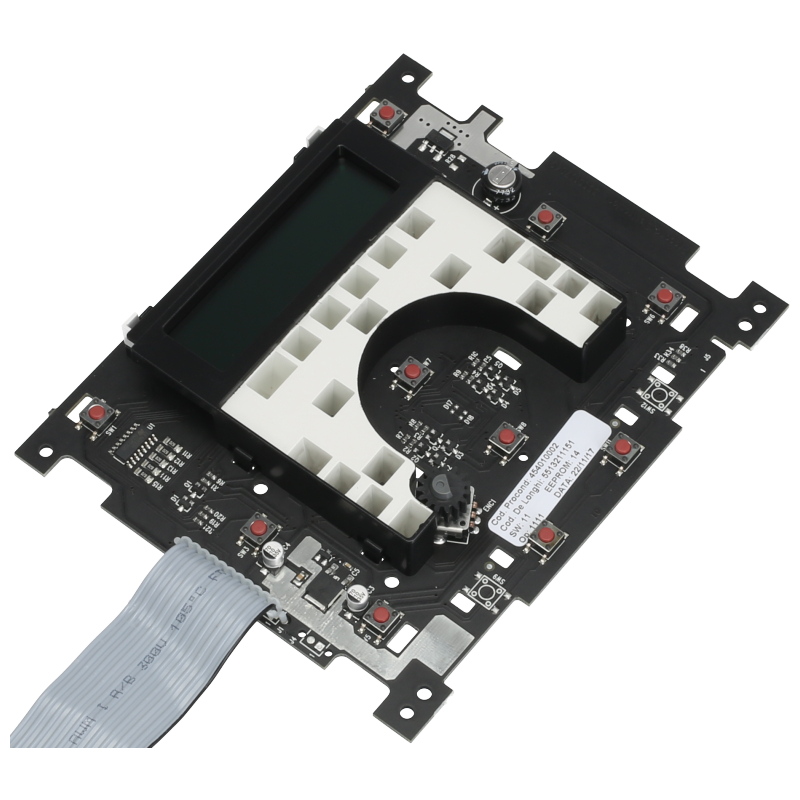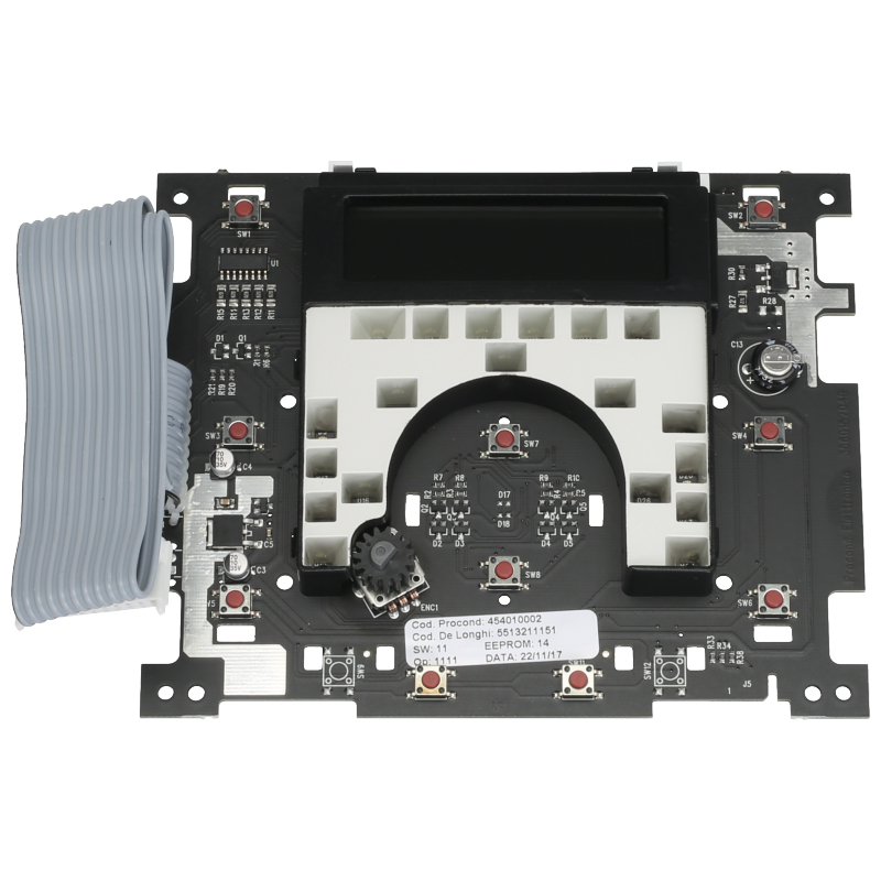 Moduł sterujący do ekspresu DeLonghi ESAM55xx. Płytka elektroniczna montowana w panelu przedniego urządzenia, odpowiadająca za kontrolę wszystkich funkcji kawoariusza. W zestawie: płytka sterująca z wyświetlaczem, szerokie złącze zasilające oraz przyciski obsługi. Oryginalna część zamienną do modeli ESAM 5500.L Perfecta i ESAM 5500.M Perfecta Cappuccino.
