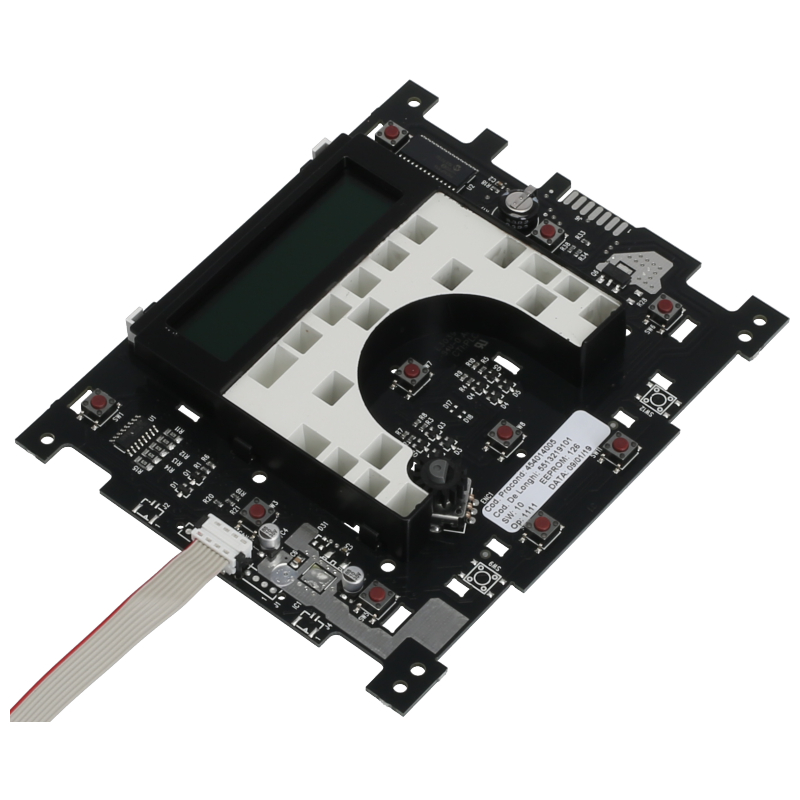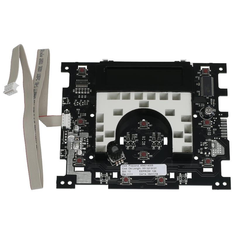 Płyta sterująca z wyświetlaczem do automatycznego ekspresu DeLonghi Perfecta ESAM 5500 EX:2. Moduł elektroniczny odpowiada za kontrolę wszystkich funkcji urządzenia. Zestaw zawiera płytę sterowniczą z ekranem LCD i cienkim przewodem połączeniowym (szerokość 1 cm). Ważna informacja: jeśli posiadasz model ESAM 5500 bez oznaczenia EX:2, wymagana jest inna płyta sterownicza (5513214691) z szerszym przewodem. Kompatybilna z modelami: ESAM 5500.B EX:2, ESAM 5500.M EX:2, ESAM 5500.S EX:2, ESAM 5500.T EX:2.