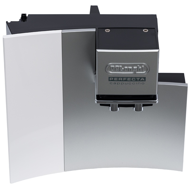 Frontowa drzwiczka do ekspresu DeLonghi ESAM 5500.W Perfecta Cappuccino w kolorze srebrno-białym. Część zawiera regulowany suwak do dozowania kawy, który umożliwia precyzyjne ustawienie ilości spadu ziaren. Kompletny zestaw gotowy do montażu.