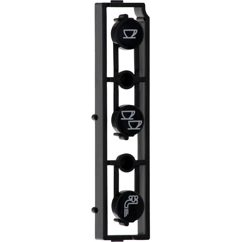 Zestaw przycisków do ekspresu DeLonghi z symbolami filiżanki, dwóch filiżanek i kranu. Przyciski znajdują się na przedniej, prawej części panelu sterowania urządzenia. Oryginalna część zamienна do serii ESAM 5500. Zestaw zawiera kompletną rzędę przycisków jak na zdjęciu.