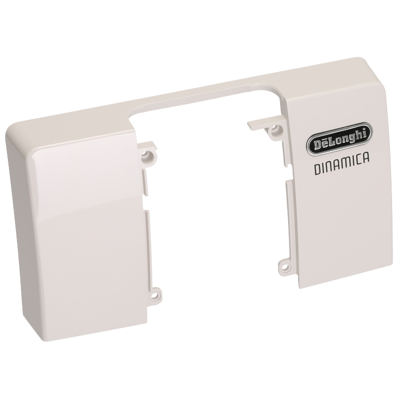 Górna obudowa frontalna do ekspresu DeLonghi Dinamica ECAM 350.55.W. Wykonana z białego tworzywa sztucznego z logo producenta. Element montowany na przedniej części urządzenia. Zastępuje oryginalną część w przypadku uszkodzenia lub zużycia. Dostarczane jako pojedyncza część gotowa do montażu.