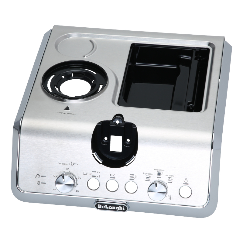 Górna obudowa do ekspresu DeLonghi La Specialista EC 9155.MB. Element wymienny montowany na górze urządzenia, dostarczany wraz z dwoma pokrętłami regulacyjnymi. Oryginalna część zamienną zapewniająca prawidłowe zamknięcie obudowy i dostęp do elementów sterujących. Kompatybilna wyłącznie z modelem EC 9155.MB.