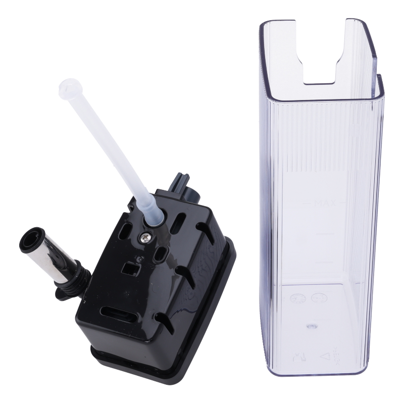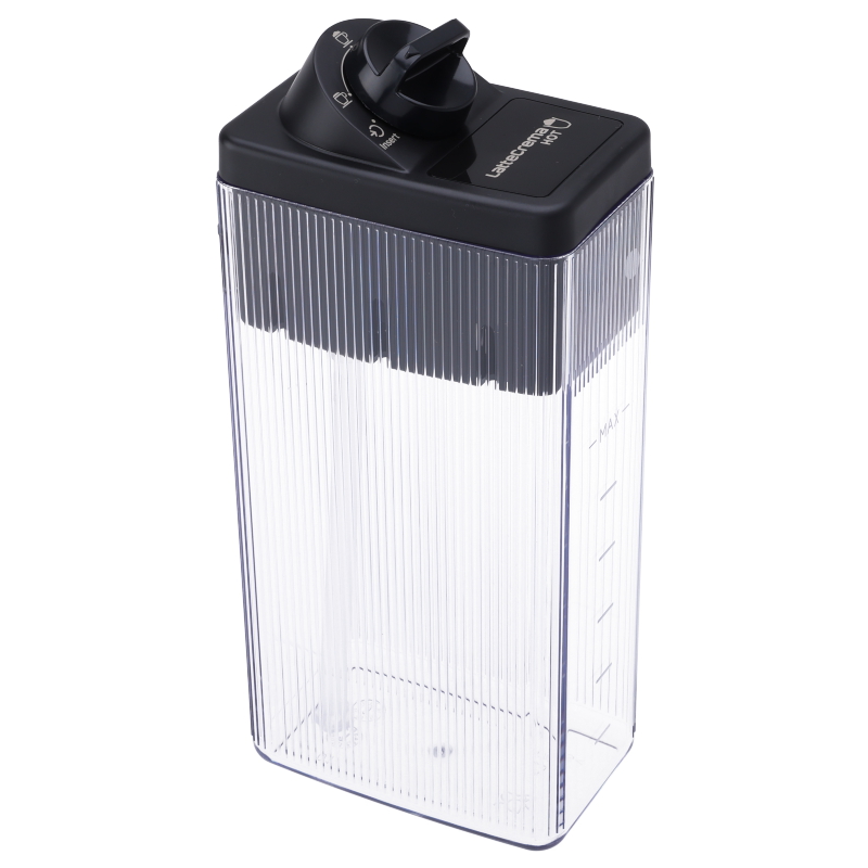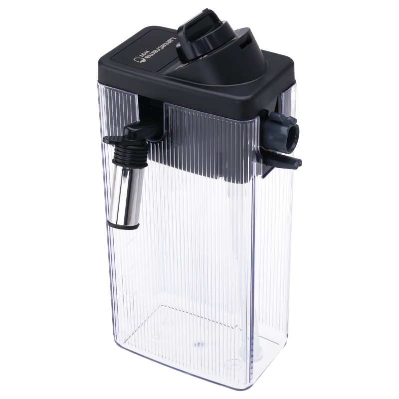 Kompletny zbiornik do mleka do ekspresu DeLonghi ECAM 380.95.TB Dinamica Plus. Zestaw zawiera pojemnik, pokrywę oraz wbudowany system do spieniania mleka, rurę ssącą i dyszę wylotową. Część oryginalna, gotowa do użytku.