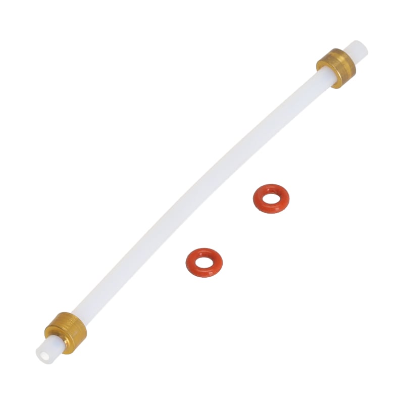 Wąż ciśnieniowy 102mm do ekspresu DeLonghi ECAM 630.xx. Łączy zaparzacz z zaworem bezpieczeństwa (7313261101). Wykonany z metalowymi pierścieniami i uszczelkami zapewniającymi niezawodne działanie. Zestaw zawiera wąż oraz 2 uszczelki (63444D). Kompatybilny z modelami PrimaDonna Aromatic.