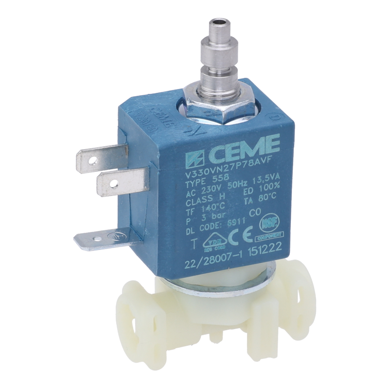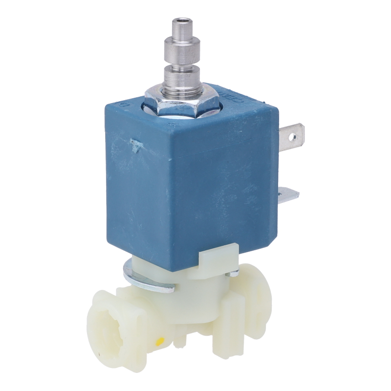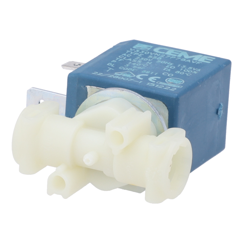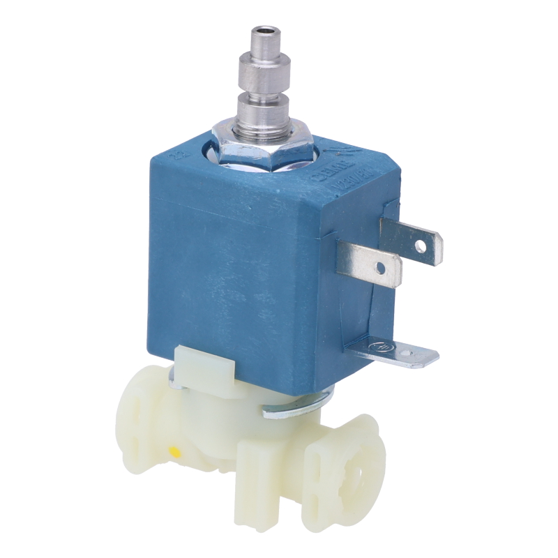 Elektromagnetyczny zawór 3-drożny do automatycznego ekspresu DeLonghi Rivelia. Zawór steruje przepływem wody w systemie parzenia. Do górnego złącza podłącza się zawór bezpieczeństwa. Z boku znajduje się złącze 90° (5313218341) i wąż ciśnieniowy (5513229921D). Do montażu wymagane są dwie uszczelki węża (art. 63444D) – nie są zawarte w zestawie i muszą być zamówione osobno.