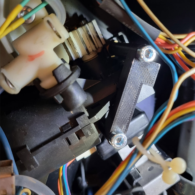Uchwyt mocujący do silnika napędowego ekspresów Jura. Jeśli uszko silnika ulegnie złamaniu, koło zębate traci kontakt z wałem napędowym zaparzacza, co powoduje hałaśliwe ratowanie bez ruchu głowicy. Ten uchwyt umożliwia ekonomiczne naprawienie silnika bez konieczności drogiego zakupu nowego zespołu. Może być również zainstalowany profilaktycznie zamiast oryginalnych śrub, aby zapobiec pękaniu flanszy obudowy silnika. Montaż za pomocą 2 śrub imbusowych. Zawartość: uchwyt ze śrubami.