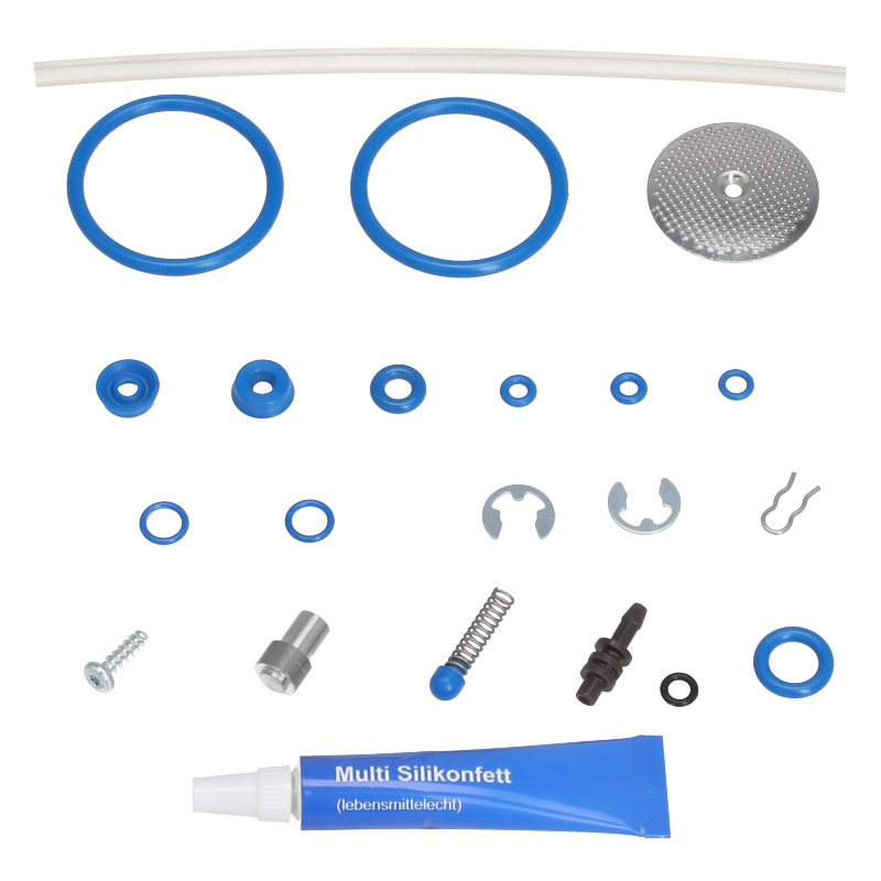 Kompletny zestaw serwisowy do zaparzacza Jura 72318 zawierający wszystkie niezbędne części zamienne. W skład wchodzą: o-ringi do kolby, zawór crema, sito ze stali nierdzewnej, uszczelki do rury wznoszenia, uszczelka zaworu drażnika, o-ring do dyszy próżniowej, pierścienie zabezpieczające wału, złączka do wylewu kawy, silikonowy wąż, klipsy, śruba obudowy oraz smar silikonowy spożywczy. Zestaw umożliwia pełną regenerację zaparzacza do stanu zbliżonego do nowego. Zawiera instrukcję montażu kapturka zaworu.